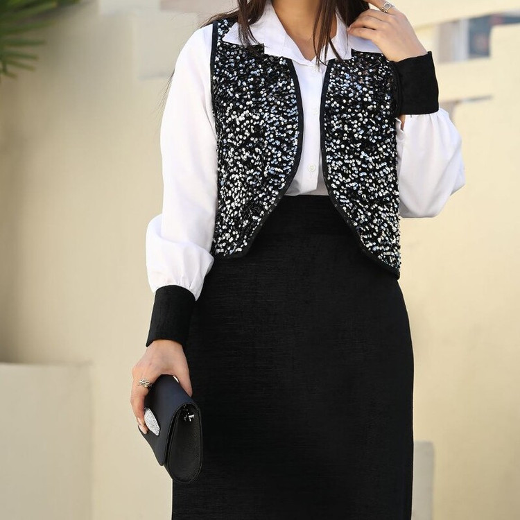 🧶جنس پارچه وست و دامن مخمل خرج کار پولک و شومیز تترون درجه یک ' مناسب فصل بهار و تمام فصل ها * کیفیت پارچه ،دوخت و تنخور عالی