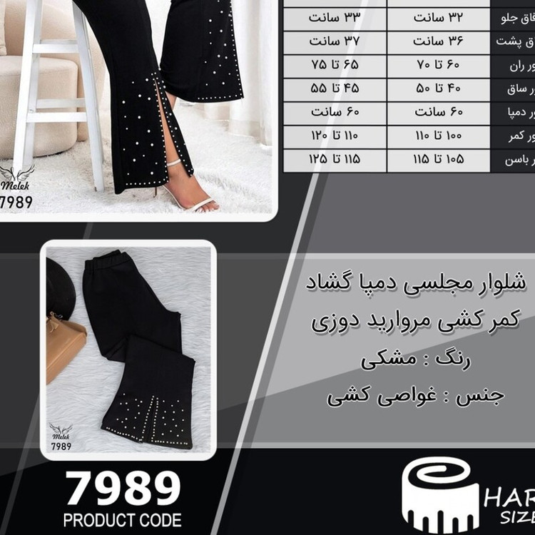 🔸 شلوار مجلسی دمپا گشاد کمر کشی مروارید دوزی 🔸 کد : 7989 رنگ : مشکی 🔸 جنس : غواصی کشی سایز 3XL سایز 4XL قد شلوار بین ۱۰۰ تا ۱۰۵