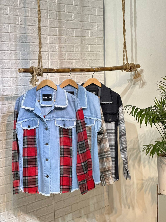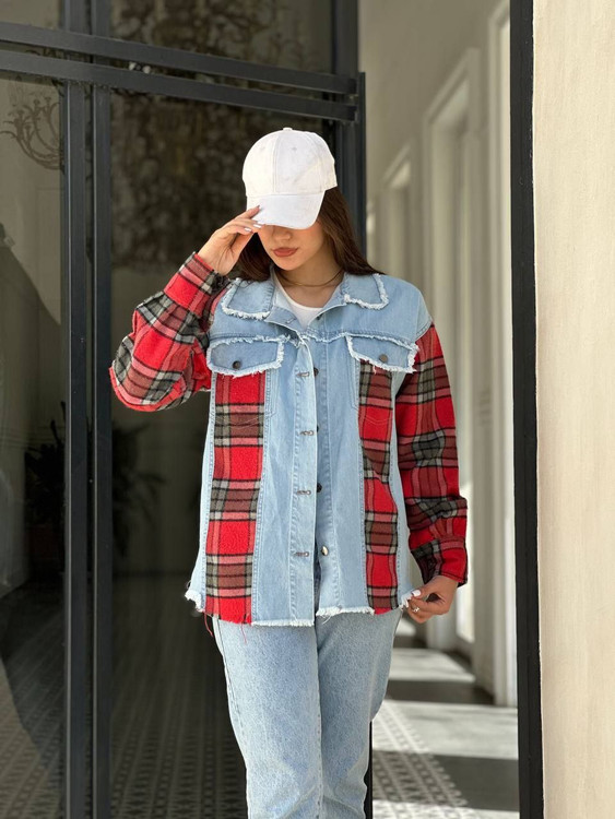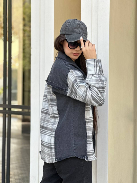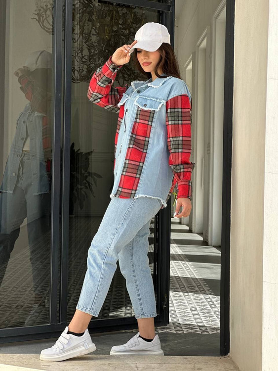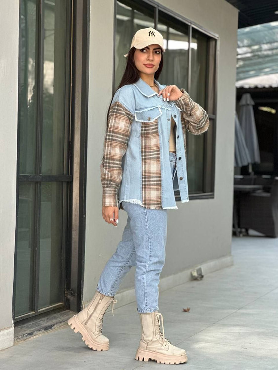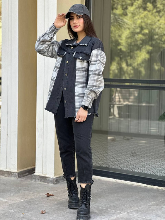 🔸 جین ترکیب با پشمی چهارخونه با کثیف دوزی های اسپرت🔸