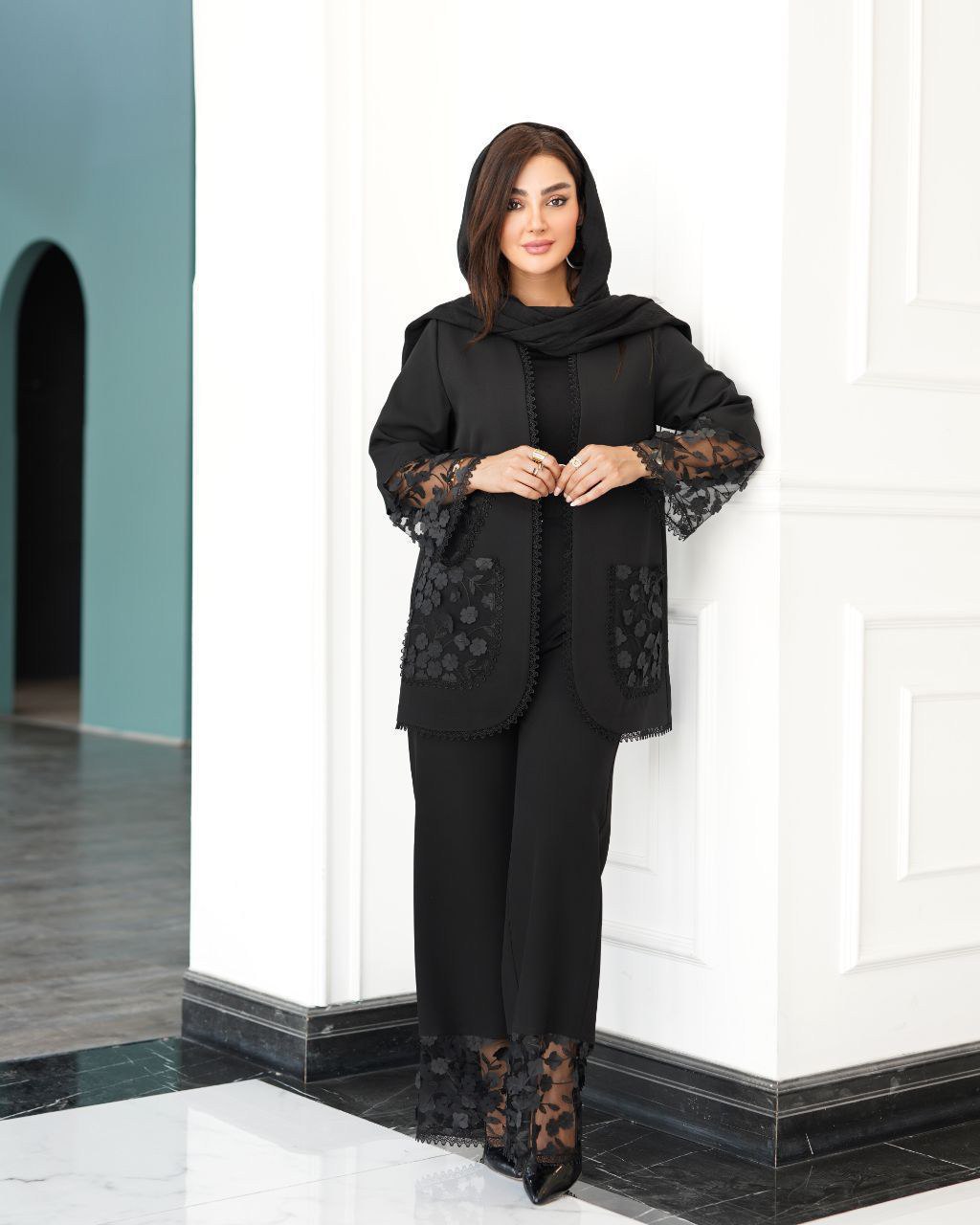 کت شلوار مشکی مجلسی زنانه گیپور دار