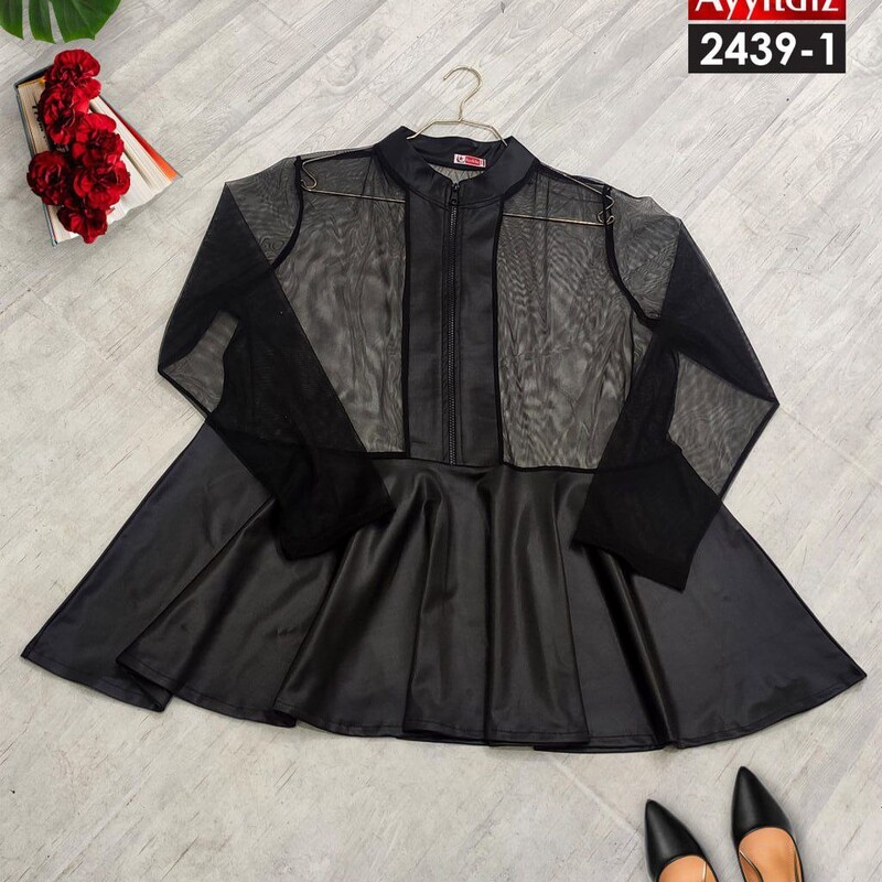 2439 شومیز مجلسی خاص بیگ سایز ۴ ایکس مناسب ۴۴ تا ۵۰ ۵ ایکس مناسب ۵۲ تا ۵۸ جنس چرم و تور اعلا رنگ : مشکی