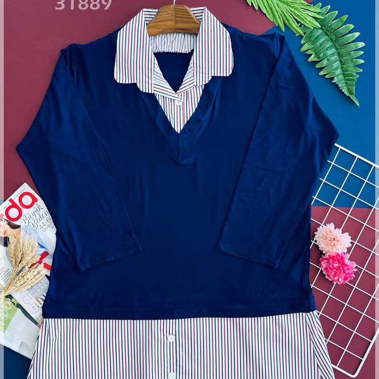 تونیک شیک و اسپورتمون که قسمت های سرمه ای از پارچه پنبه و قسمت های راه راه از تترون هست.